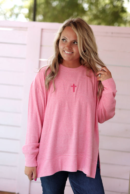 Cross 3DEmbroidery - Cozy DayBrushed Waffle Pullover (Coral)