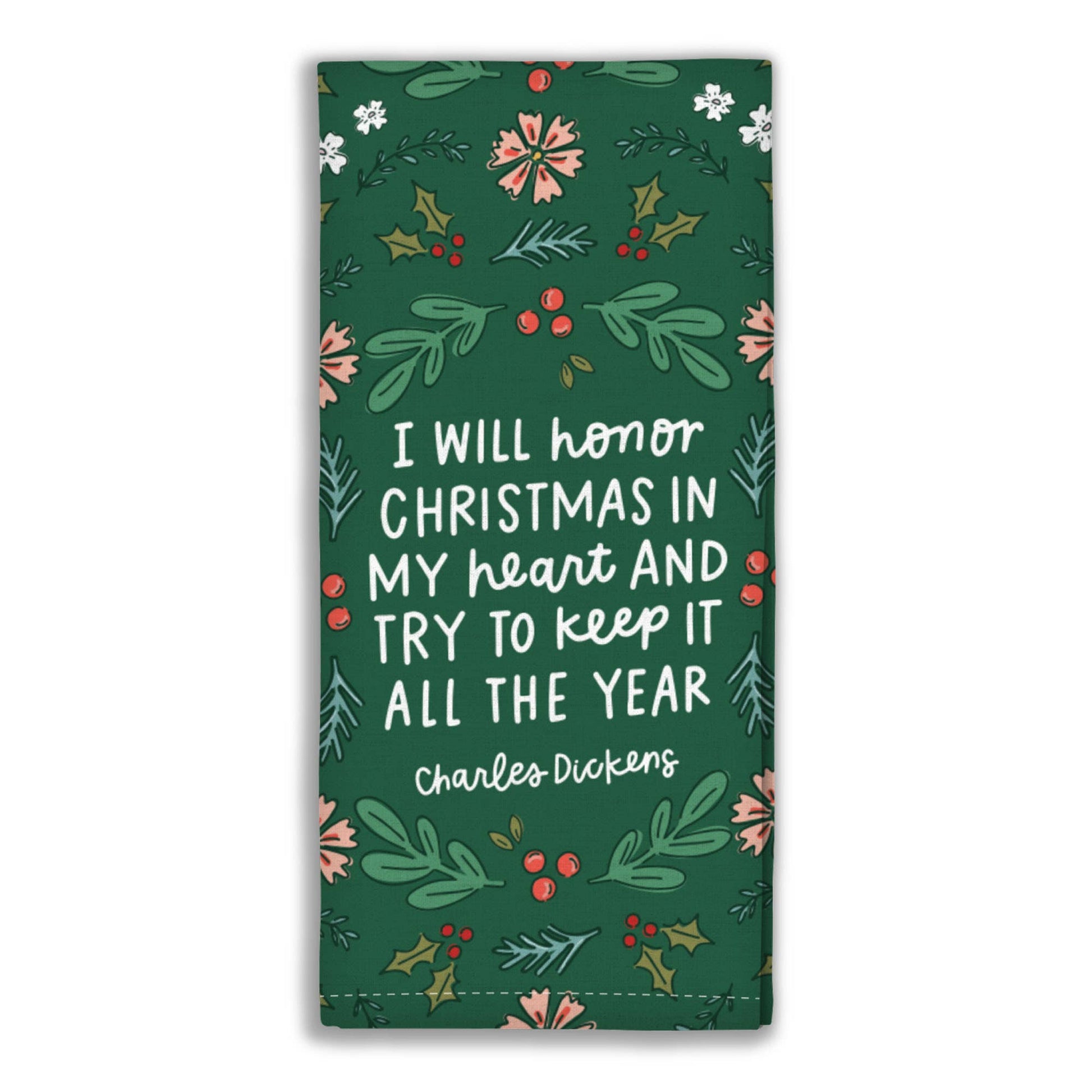 Infuse your kitchen with holiday cheer with our Christmas In My Heart Tea Towel! Featuring a hand-illustrated pattern of festive holly and winter florals, this towel adds a merry touch to any space. With the timeless words of Charles Dickens, 'I will honor Christmas in my heart and try to keep it all the year', it's a joyful reminder to embrace the spirit of the season every day. Perfect for drying dishes or adding a festive accent to your decor, this tea towel brings warmth and happiness to your home. Ideal for Christmas enthusiasts or anyone who loves a touch of holiday magic, our Christmas In My Heart Tea Towel makes a jolly gift for friends, family, or yourself. Let the joy of Christmas fill your heart and home all year round!